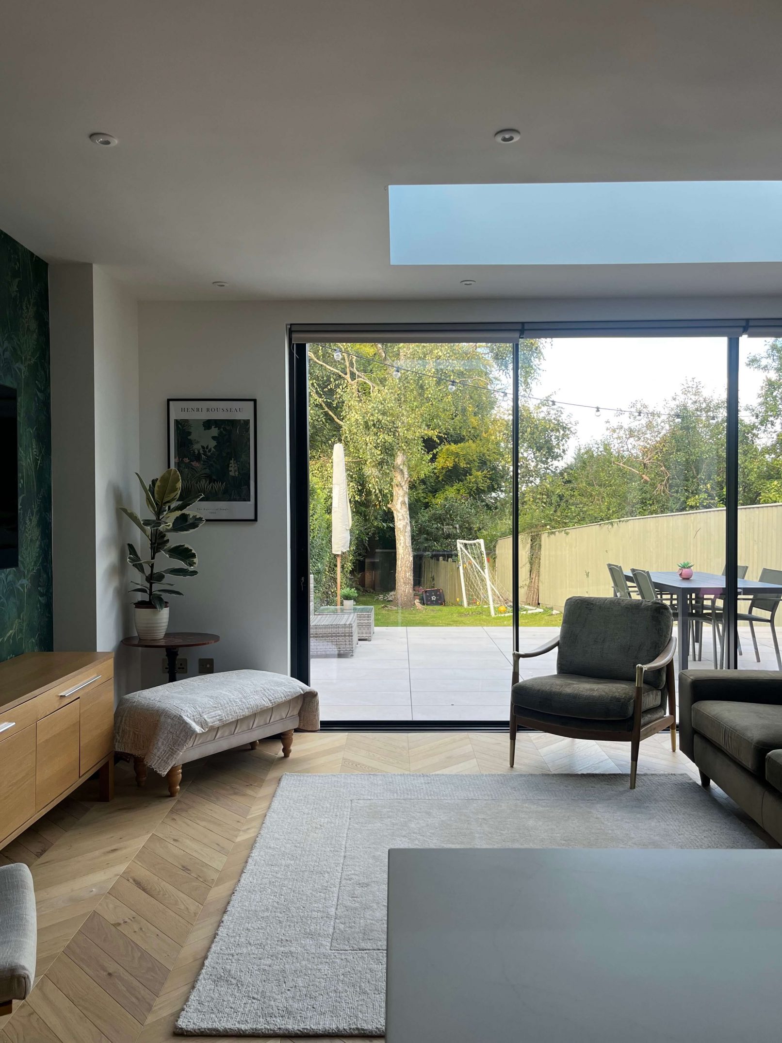 To maximize natural light and capture garden views, we added strategically placed rooflights, along with large windows and doors on the side elevations. These design elements not only brighten the interior but also frame beautiful views of the newly landscaped garden areas.