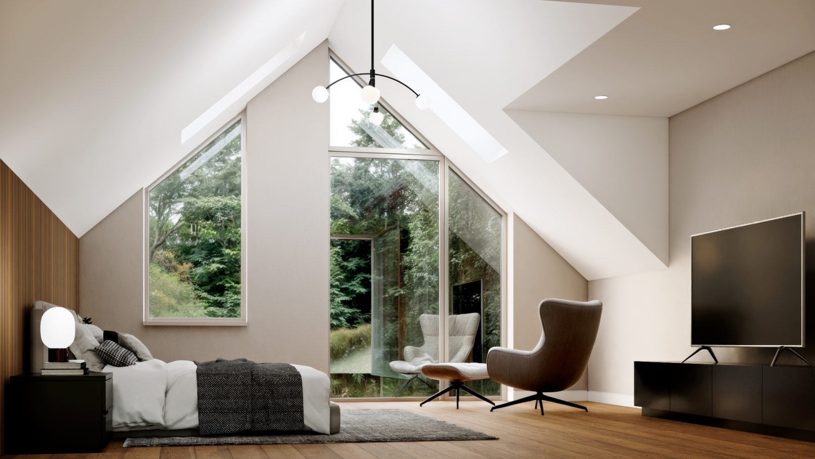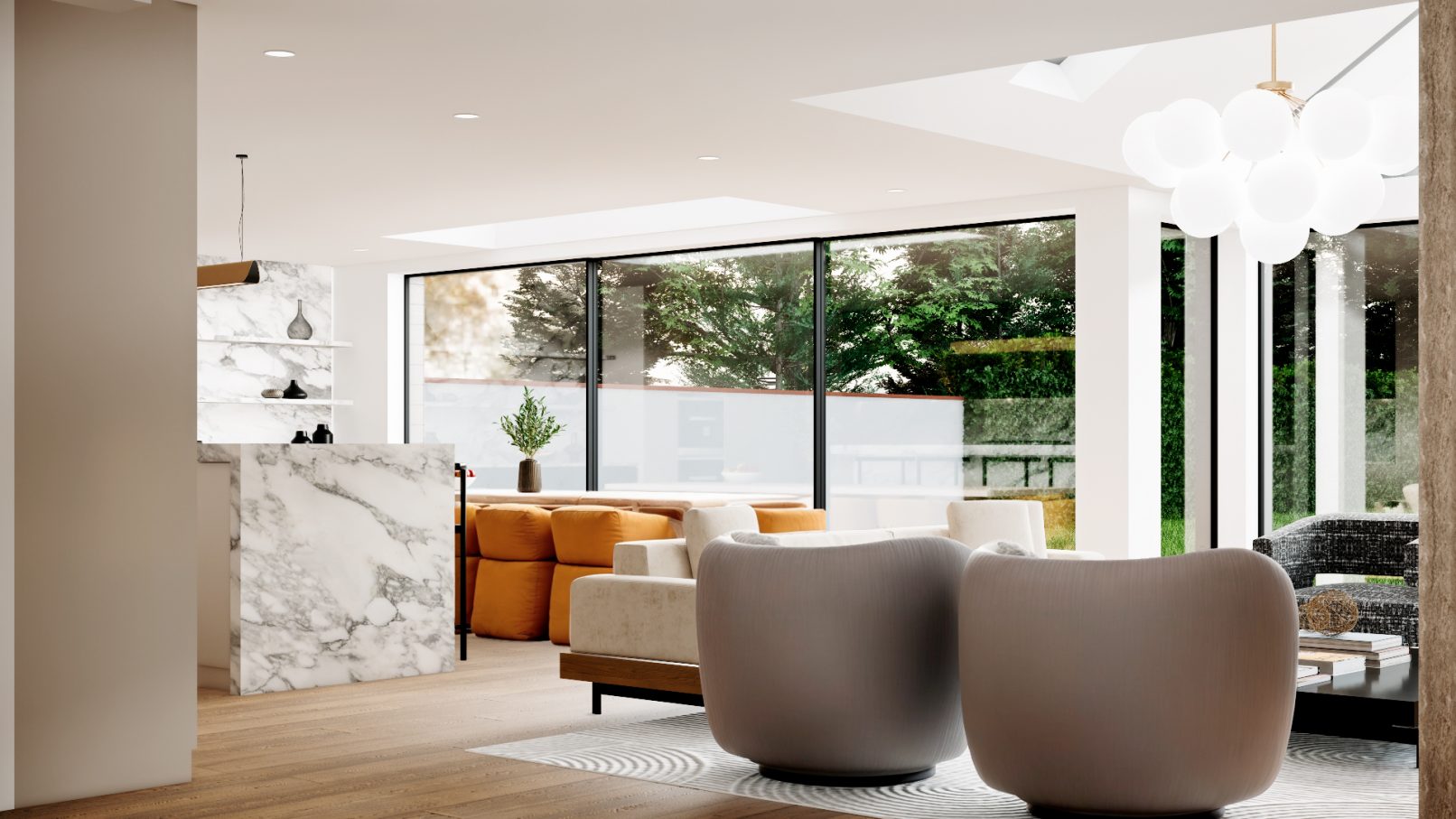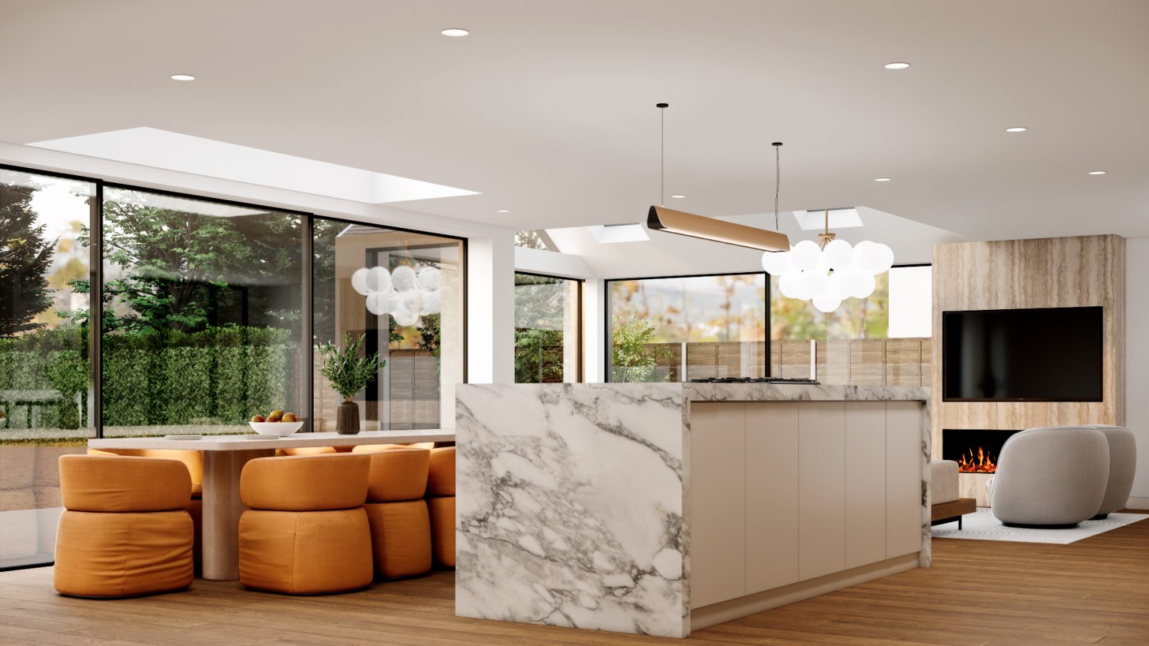 At ground floor level, the extension introduces a generous open-plan kitchen and dining space. Vaulted ceilings and full-height sliding glazed doors maximise natural light and create a seamless connection between the interior and garden. The design encourages fluid movement and modern family living.